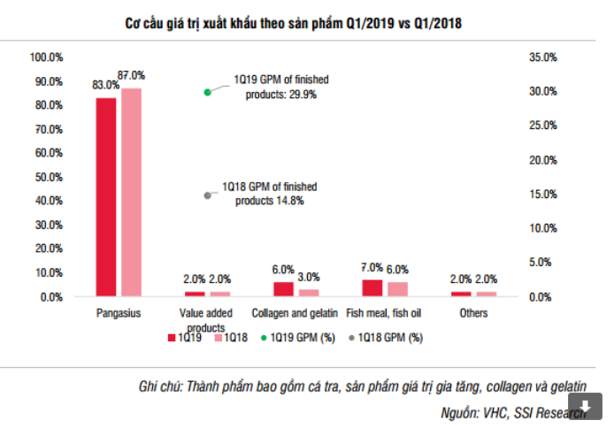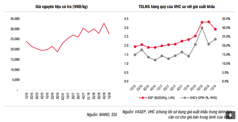 VHC đã công bố kết quả kinh doanh ấn tượng trong quý 1/2019 với lợi nhuận sau thuế là 307 tỷ đồng, +213.9% YoY, hoàn thành 24.5% kế hoạch năm. Doanh thu giảm 0.8% YoY đạt 1,789 tỷ đồng, hoàn thành 17.8% kế hoạch năm. Trong đó doanh thu thành phẩm đạt 1.29 nghìn tỷ đồng, -6.6% YoY và chiếm 72% tổng doanh thu (giảm từ 76.4% trong quý 1/2018). Tăng trưởng doanh thu của VHC trong Q1/2019 thấp hơn tăng trưởng kim ngạch xuất khẩu ở mức 11% YoY ($ 76 triệu USD, ~ 1.76 nghìn tỷ đồng). Doanh thu xuất khẩu tăng trưởng thấp hơn so với Q4/2018 (44% YoY) là do giá bán giảm so với quý trước, trong khi hai thị trường xuất khẩu truyền thống là Hoa Kỳ và Trung Quốc đều chứng kiến mức giảm lần lượt là 5% YoY và 1.8% YoY trong Q1/2019. Tuy nhiên, kết quả của VHC tốt hơn so với giá trị xuất khẩu cá tra Việt Nam nói chung ở mức 7.8% YoY trong Q1/2019 (so với 18% YoY trong Q1/2018). Bên cạnh đó, giá nguyên liệu giảm xuống mức thấp 24,000 – 25,000 đồng/ kg vào tháng 3-2019 từ mức cao nhất vào tháng 10-2018 là 34,000 đồng / kg.