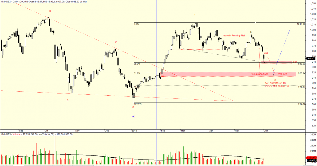 Tôi đang tìm kiếm mức hỗ trợ quan trọng tại 915-920 tạo bởi (1) Fibonacci 61.8%; (2) Khoảng trống giá (3) Mục tiêu giá của mẫu hình Vai Đầu Vai. Đây là vùng kiểm tra quan trọng. Theo lý thuyết sóng Elliott, sóng 2 nên thoái lùi theo tỷ lệ Fibonacc 61.8% so với sóng 1 là phổ biến.