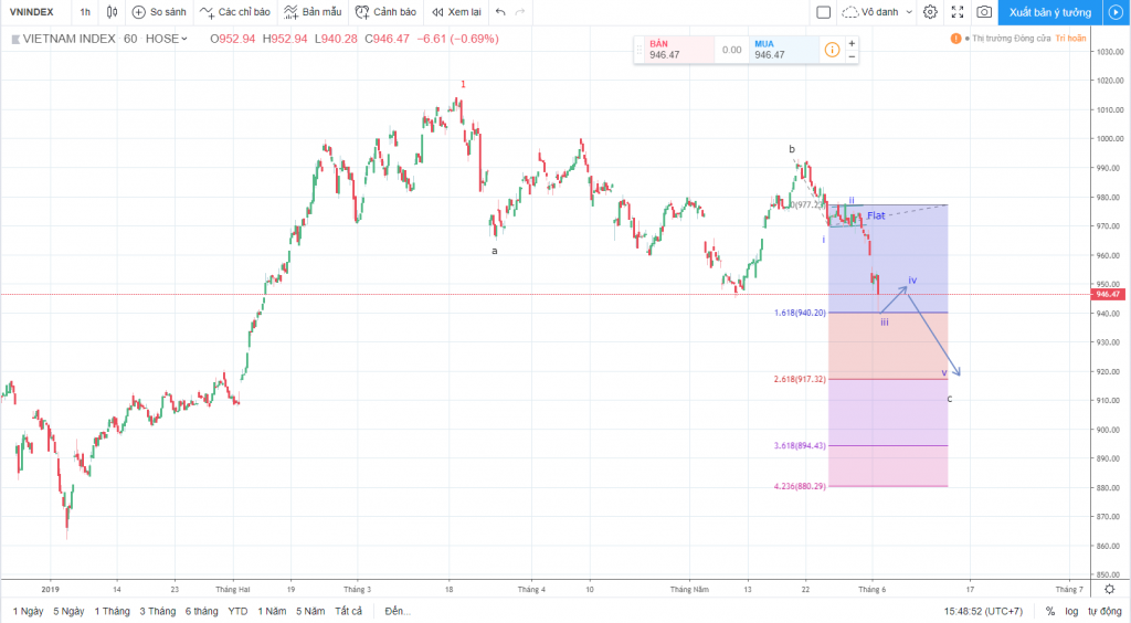 Mức giá 938 điểm tương ứng với Fiboacci 1.618 của sóng i. Sóng ii có dạng phẳng. Rất có thể trong các phiên tiếp theo sẽ là các phản ứng hồi bulltrap theo sóng iv. Nhưng lưu ý, thị trường vẫn còn nhịp giảm theo sóng v.