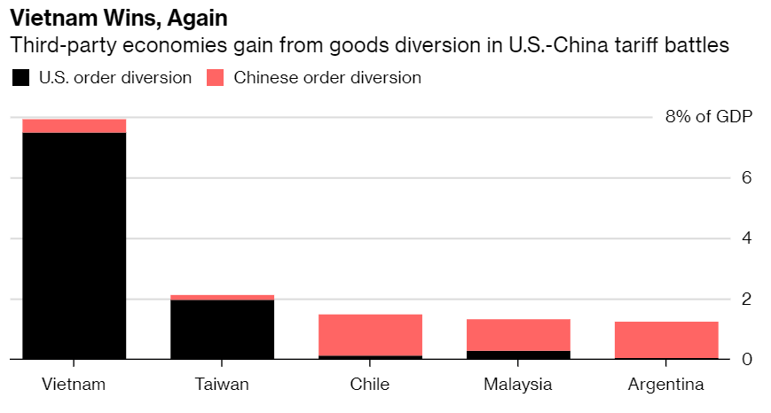Việt Nam, quốc gia thuộc khu vực Đông Nam Á có chung đường biên giới với Trung Quốc, đã nhận được các đơn đặt hàng từ việc chuyển hướng thương mại bằng 7,9% GDP cho đến quý I/2019.