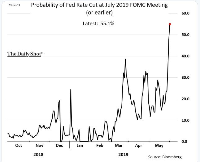 Tờ Wall Street Journal cho biết, kỳ vọng Fed cắt giảm lãi suất trong cuộc họp FOMC tháng tới (30-31.7) đã tăng vọt lên trên 55.1% (Fed sẽ họp phiên gần nhất vào ngày 18-19.6.2019). Sự sụt giảm gần đây của TTCK và giá dầu đang đẩy kỳ vọng FED cắt giảm lãi suất lên cao vì Fed đã từng tuyên bố “Sẽ cân nhắc hạ lãi suất nếu lạm phát hạ nhiệt”.