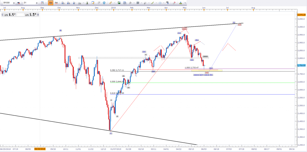 Trên mô hình sóng Elliott, SP500 đang có hỗ trợ mạnh tại 2710-2730 được tạo bởi (1) đáy của sóng (b) cũ.;(2) Tỷ lệ Fibonacci 38.2% của đợt tăng đầu năm 2019 và (3). Chiều dài sóng (a)=sóng (b) trong sóng [x]. Đây là vùng hỗ trợ mạnh.