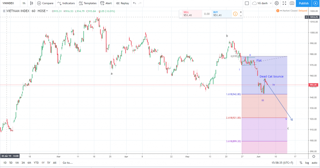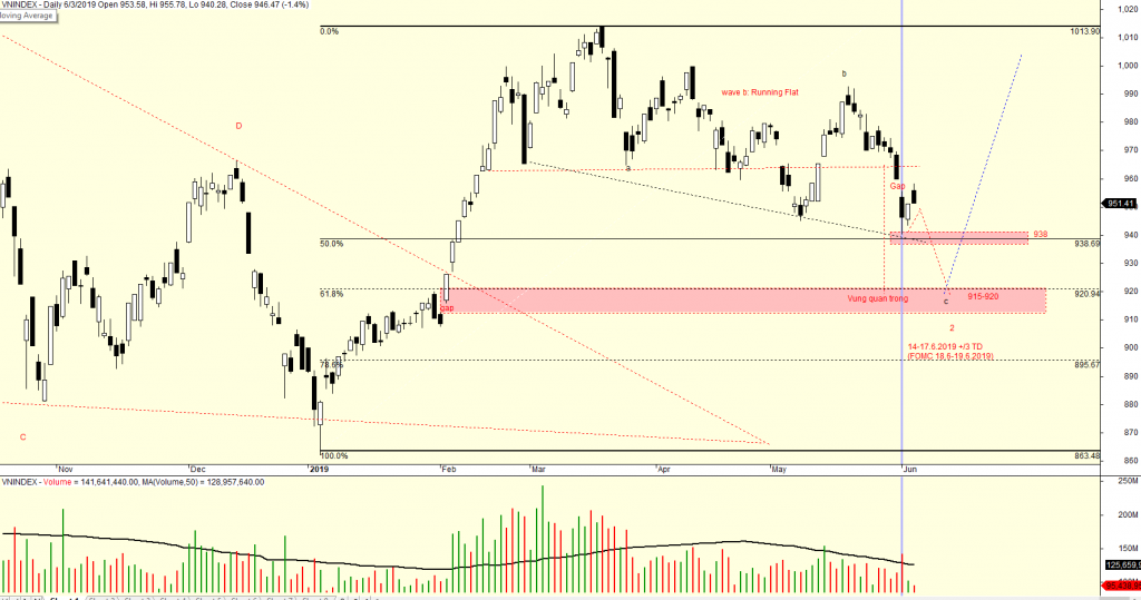 Không có gì thay đổi trong quan điểm của tôi về xu hướng thị trường. Vì thế, các bình luận cũng rất ngắn gọn. Quan điểm chi tiết đã nêu ở bài viết cũ. Chúng ta chờ đợi khả năng tạo đáy ở mốc thời gian 14-17.6.2019 +/-3TD khi mà cuộc họp của FED sẽ diễn ra vào ngày 18-19.6 (với kỳ vọng FED giảm lãi suất) và cuôc gặp giữa Trump và Tập Cận Bình vào ngày 20.6 tại cuộc họp G20 (diễn ra tại Osaka – Nhật Bản).
