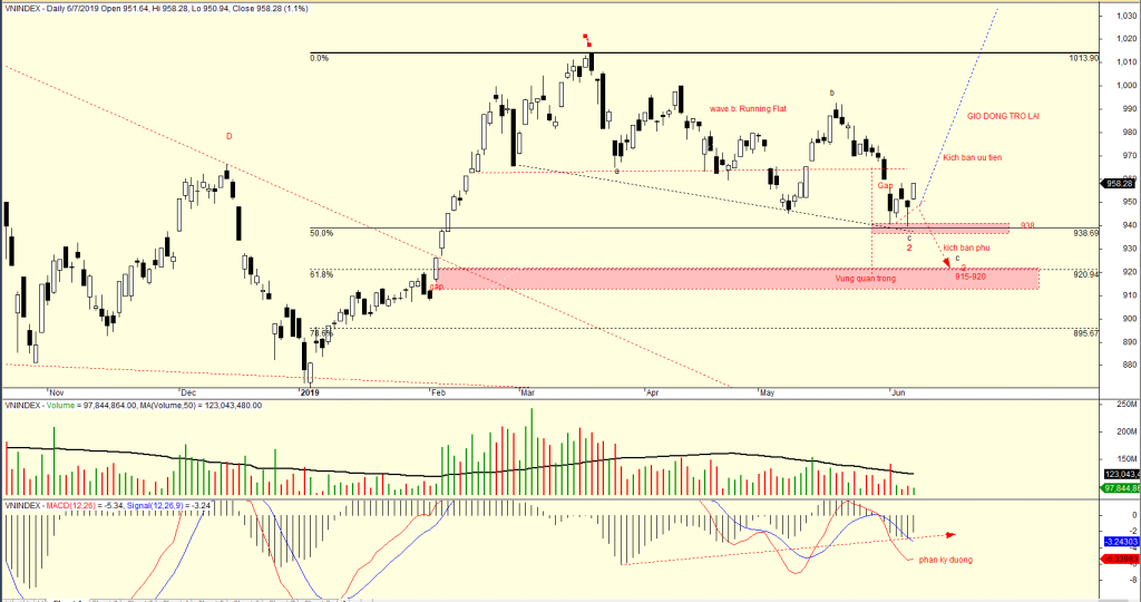 Trên đồ thị giá, tôi đang đếm ‘”NGÀY 2″ cho chỉ số VN-Index. Ngày 1 rơi vào ngày 6/6/2019 khi giá đóng cửa ở nửa trên khung giá ngày. Theo phương pháp CANSLIM của William O’Neil, chúng ta chờ đợi sự xác nhận ở ngày 4-ngày 7 khi có Ngày Bùng Nổ Theo Đà. Chú ý, TTCK Mỹ đã có 3 phiên tăng điểm liên tiếp.