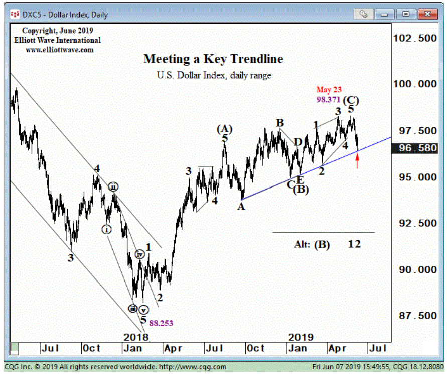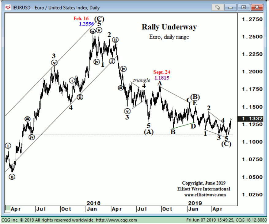 Sự kết thúc của sóng 5 tại 1.1107 vào ngày 23/5/2019 đánh dấu sự xuất hiện của sóng chéo (Digonal). Phiên ngày 6/6/2019, EUR/USD hoàn tất cú hồi phục từ điểm phá vỡ của sóng chéo và vượt qua đỉnh sóng 4. Với sự thay đổi này, tôi cập nhật mô hình sóng Elliott như hình dưới. Mục tiêu giá của EUR/USD sẽ là đỉnh tại ngày 10/1/2019, tức 1.1570
