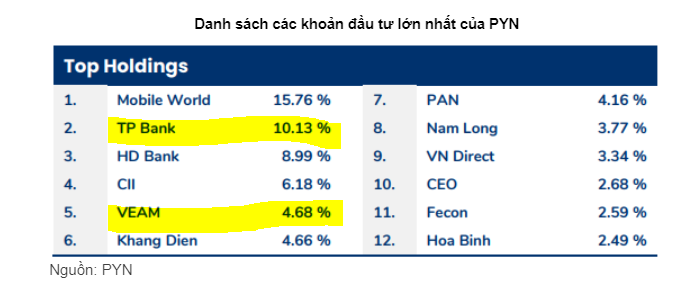 Đáng chú ý, HBC đã bị loại ra khỏi top 12 khoản đầu tư lớn nhất của Pyn Elite Fund, cái tên thay thế là STB với tỷ trọng 1,67%. Như vậy, trong top 12 khoản đầu tư của Pyn Elite Fund hiện có tới 3 cổ phiếu ngân hàng gồm TPB, HDB, STB với tổng tỷ trọng 21,85%.