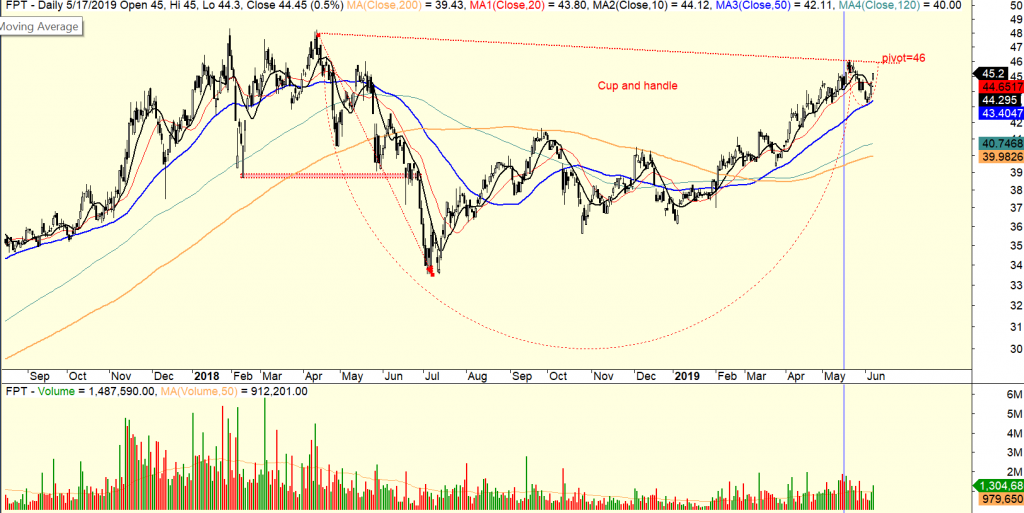 Mẫu hình chiếc cốc-tay cầm là một trong những mẫu hình phổ biến sinh lợi nhất của các siêu cổ phiếu. Bộ lọc của tôi quét thấy FPT xuất hiện trong danh sách mua (giá mua 43.6). FPT đang hình thành phần tay cầm (handle) với điểm pivot =46. Độ sâu chiếc cốc là 30%, thời gian hình thành hơn 40 tuần và là NỀN GIÁ 1.