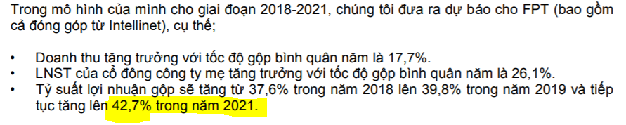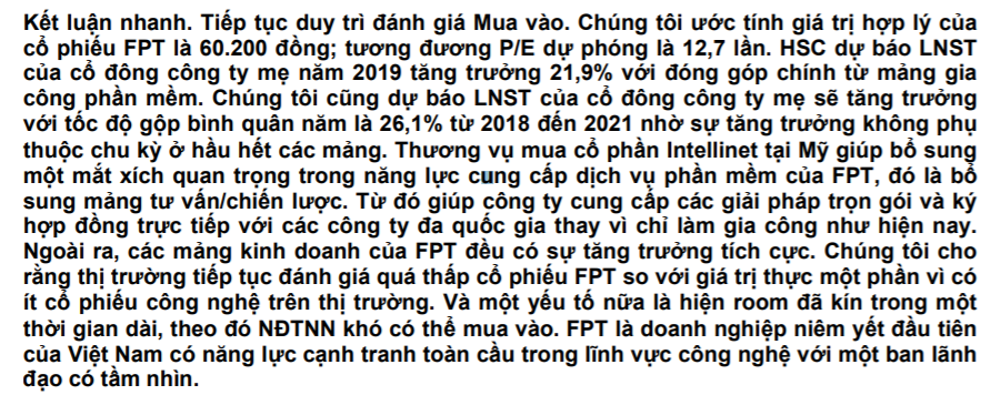 - ACBS (Báo cáo ngày 8/5/2019): Chúng tôi dự phóng trong 2019 FPT sẽ đạt doanh thu thuần 26.869 tỷ đồng (+15,7% n/n) và LNTT là 4.473 tỷ đồng (15,9% n/n). Kết hợp phương pháp DCF và P/E (cụ thể, P/E mục tiêu cho hoạt động xuất khẩu phần mềm là 23x, dịch vụ viễn thông là 14x và các hoạt động khác là 10-12x), giá mục tiêu của chúng tôi là 66.320 đồng/cp. MUA.