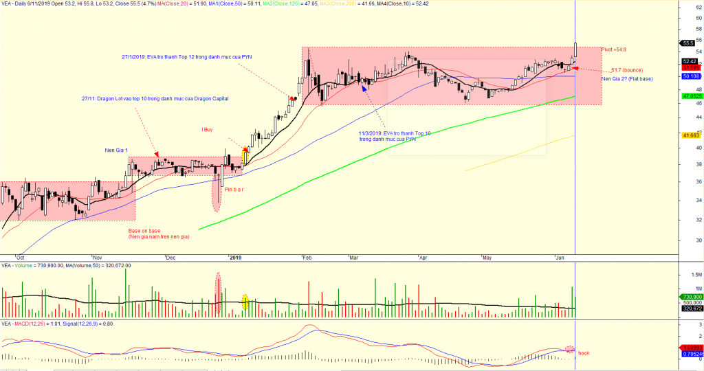 Như tôi trong bài viết ngày hôm qua, ngay cả khi thị trường chung chưa xuất hiện Ngày Bùng Nổ Theo Đà, các cổ phiếu leader vẫn rất mạnh. Điển hình của phiên hôm nay chính là VEA. Phiên ngày 11/6/2019, VEA chính thức có điểm breakout khi giá vượt lên trên điêm pivot của mầu hình Nền Giá Phẳng (một số bạn xem đây là mẫu hình Hai Đáy, tôi nghĩ đều được). Với việc đã mua ở giá 51.7 theo tín hiệu sớm gọi là Bounce, các bạn đọc của Chiemtinhtaichinh đang có lợi thế lớn.