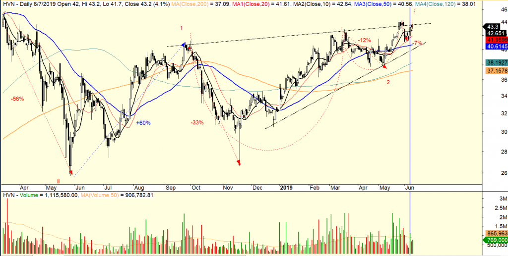 Cổ phiếu HVN đang có mẫu hình độ biến động thu hẹp (VCP) của phù thủy Mark Minervini. Theo đó. HVN đã tạo đáy sớm trước thị trường chung vào tháng 6.2018 (VN-Index tạo đáy vào ngày 6.1.2019), một dấu hiệu của cổ phiếu leader. Sau đó, HVN tăng giá hơn 60% trong giai đoạn 4 tháng, nhanh hơn mức tăng 15% của VN-Index trong cùng thời gian.