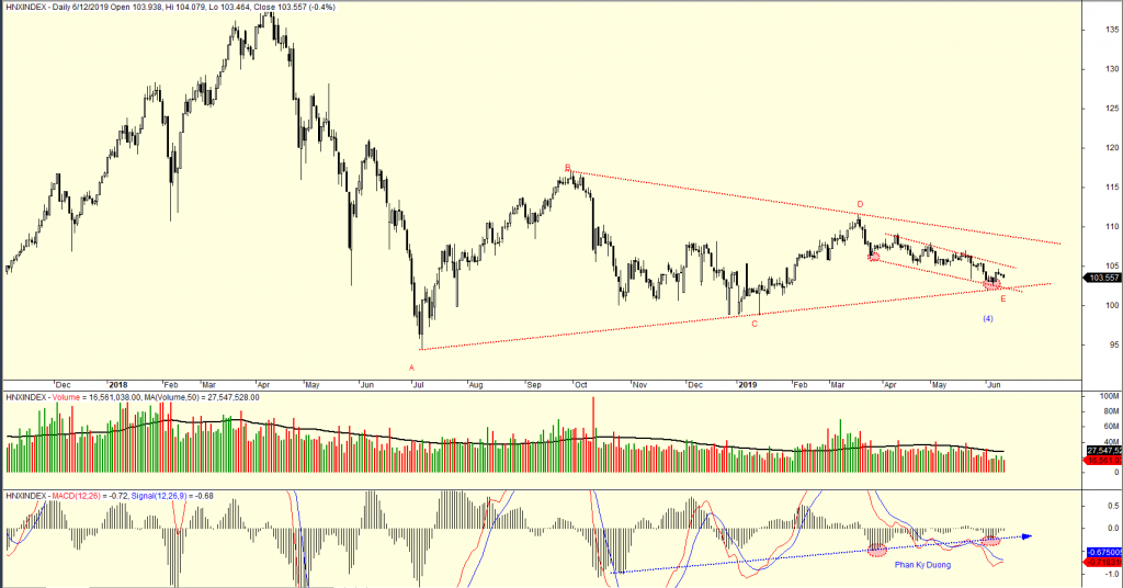 Trước hết, thử nhìn sang HNX-Index. Tôi đang nhìn thấy HNX-Index kiểm tra đường xu hướng nối đáy A và C, và gọi đó là điểm E. Chúng ta cũng đang có một tín hiệu phân kỳ dương giữa HNX-Index và MACD Histogram. Nhưng cần phải có các phiên tăng để giá tín hiệu phân kỳ hình thành. (Vẫn cần Ngày Bùng Nổ Theo Đà).
