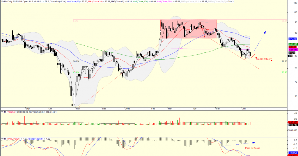 Hãy xem đồ thị giá của VHM.Chúng ta nhận thấy một phân kỳ dương đang tiềm ẩn hình thành. Chú ý phiên giảm ngày hôm nay có giá không chạm vào biên dưới của Bollinger Band. Đó thường là dấu hiệu của mẫu hình hai đáy. Trong đó, đáy thứ nhất vượt ra ngoài dãi băng Bollinger nhưng đáy thứ hai lại không cham vào (và đi kèm với phân kỳ dương với RSI hoặc MACD Histogram).