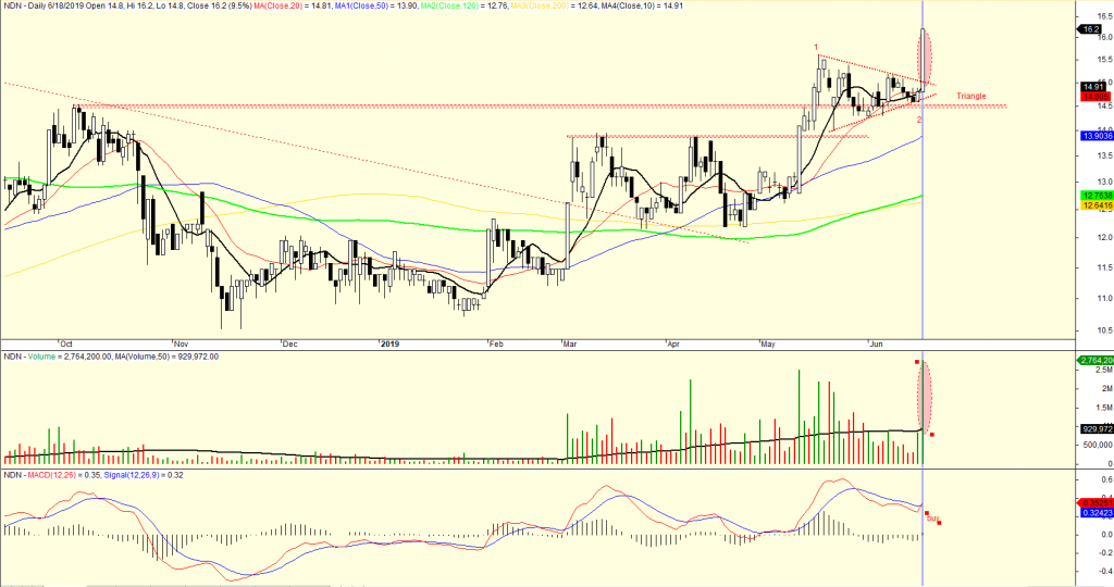 NDN là cổ phiếu ấn tượng nhất ngày hôm nay khi tăng trần. Cổ phiếu này có mẫu hình sóng tam giác (triangle) ở sóng 2 và tăng giá với thanh khoản đột biến khi tạo điểm phá vỡ. Như vậy, trong khi VN-Index đang “ngụp lăn” thì NDN đã thiết lập đỉnh cao 52 tuần. CHỉ báo MACD thiết lập tín hiệu mua.