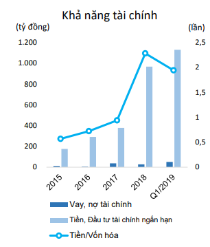 Chính lượng tiền mặt do khách hàng trả trước đã mang tới nguồn tiền lớn cho NDN. Trên báo cáo tài chính quý 1.2019, công ty có lượng tiền mặt 1,130 tỷ đồng, gấp 1.9 lần vốn hóa hiện tại. Tính theo phương pháp tiền/cổ phiếu, thì NDN đang có giá 25,000, cao hơn so với mức giá ngày hôm nay 16,200.