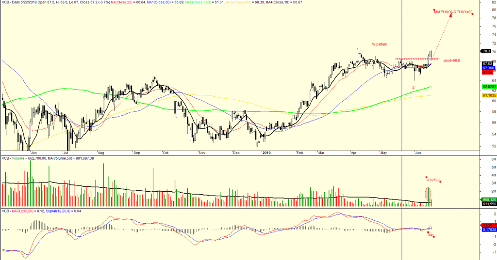 Cổ phiếu VCB đã có tín hiệu mua sau khi vượt lên trên điểm pivot của mô hình hai đáy (W) (xem mẫu hình này tại cuốn sách LÀM GIÀU TỪ CHỨNG KHOÁN)