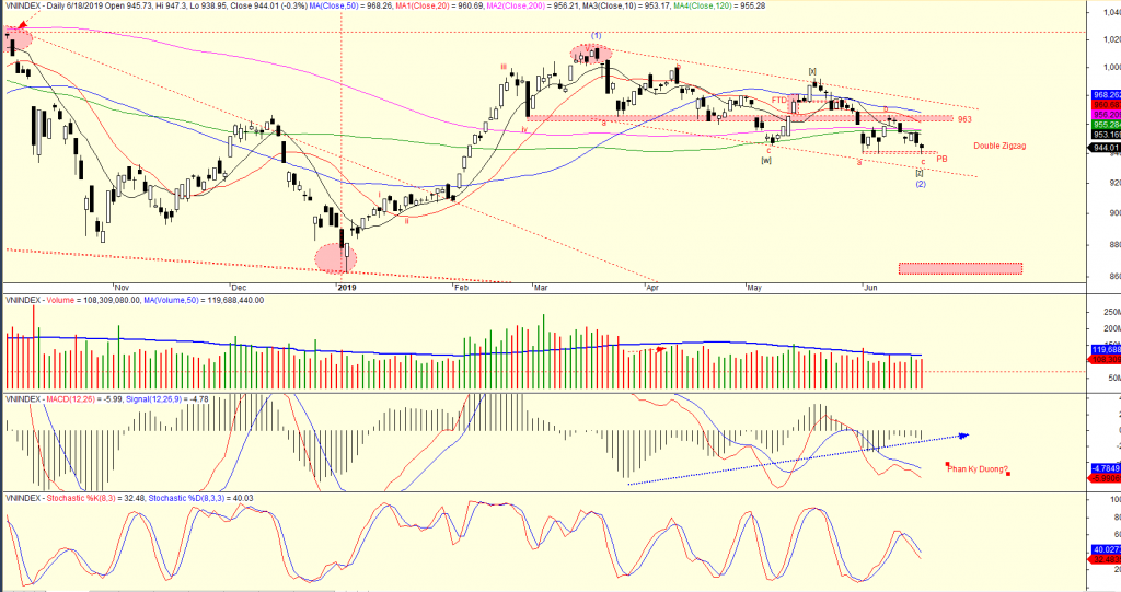 Thị trường chứng khoán Việt Nam giảm điểm nhẹ trong phiên giao dịch ngày 18/6/2019. Đây là lần thứ ba liên tiếp, VN-Index test mốc 940 điểm. Một cấu trúc sóng Double Zigzag đang được hình thành. Chỉ báo MACD Histogram tiềm ẩn phân kỳ dương với giá.