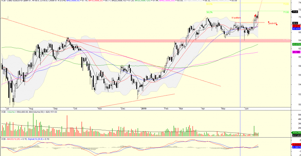 Cổ phiếu VCB được chúng tôi đưa vào danh mục đầu tư sau khi tạo điểm phá vỡ vượt lên trên điểm pivot của mẫu hình Hai Đáy (W).