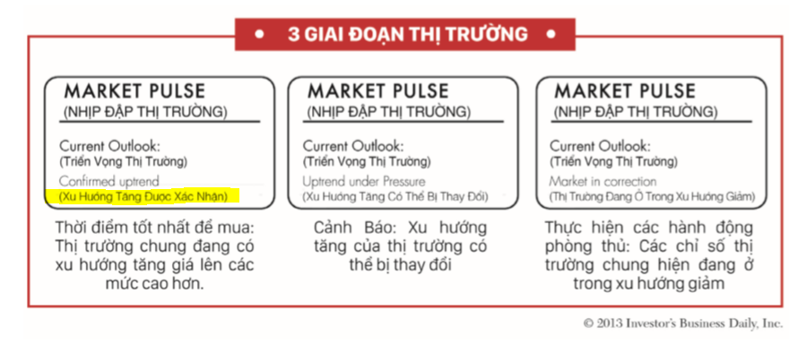 Đối với William O’Neil, thời điểm thị trường được xác nhận là ở trong xu hướng tăng giá sau khi có ngày BÙNG NỔ THEO ĐÀ. Vì thế, bạn nên thường kiểm tra hộp Nhịp Đập Thị Trường (Market Pulse) trong chuyên mục Bức Tranh Toàn Cảnh của Nhật Báo IBD để biết thị trường ở một trong ba giai đoạn sau.
