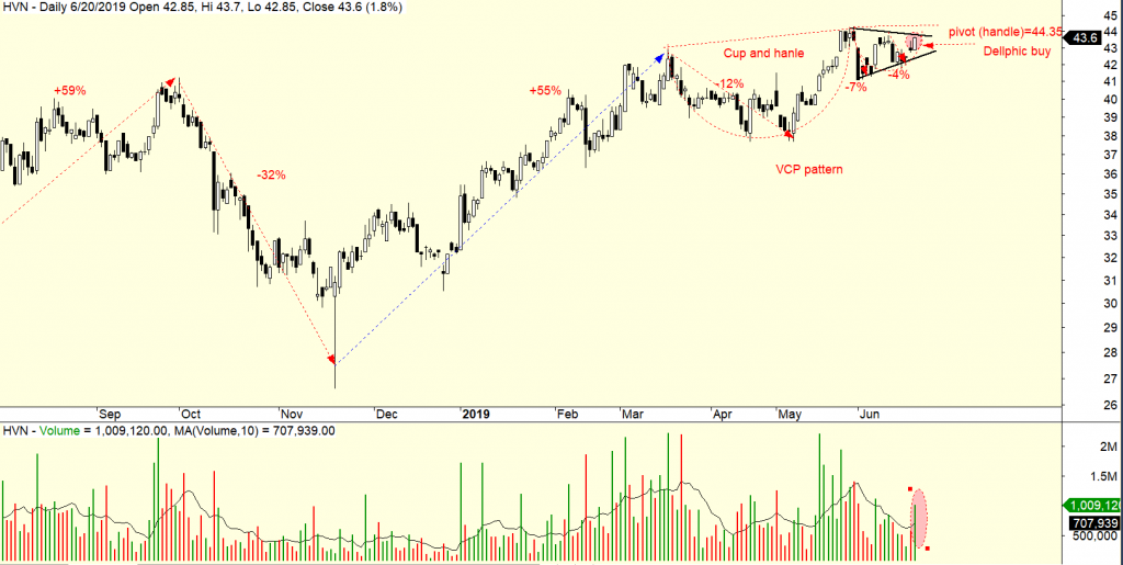 Thật tuyệt vời khi điểm mua Dellphic Buy này đang xuất hiện trước các mẫu hình giá. HVN hoặc là đang xuất hiện mẫu hình chiếc cốc-tay cầm với điểm pitvot 44.35 hoặc là đang xuất hiện mẫu hình VCP của phù thủy Mark Minervini.