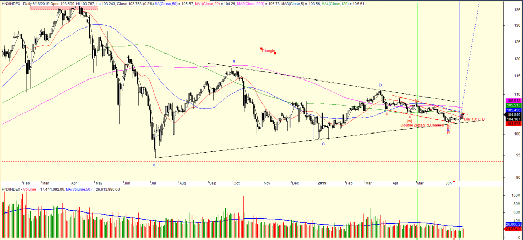 Nhìn tổng thể, HNX-Index tạo đáy vào ngày 6/6/2019 là điểm E của mô hình sóng tam giác trong sóng IV.
