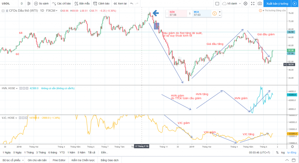 Vào tháng 1/2019, sau khi FED tạm hoãn tăng lãi suất và kiên nhẫn quan sát, TTCK toàn cầu và giá dầu cùng hồi phục. Giá cổ phiếu hàng không Việt Nam cũng hồi phục. Tuy nhiên, vào tháng 3/2019, khi giá dầu vượt ngưỡng 60 USD/thùng, giá cổ phiếu hàng không tại Việt Nam đều giảm theo xu hướng lập đỉnh của TTCK trong nước.