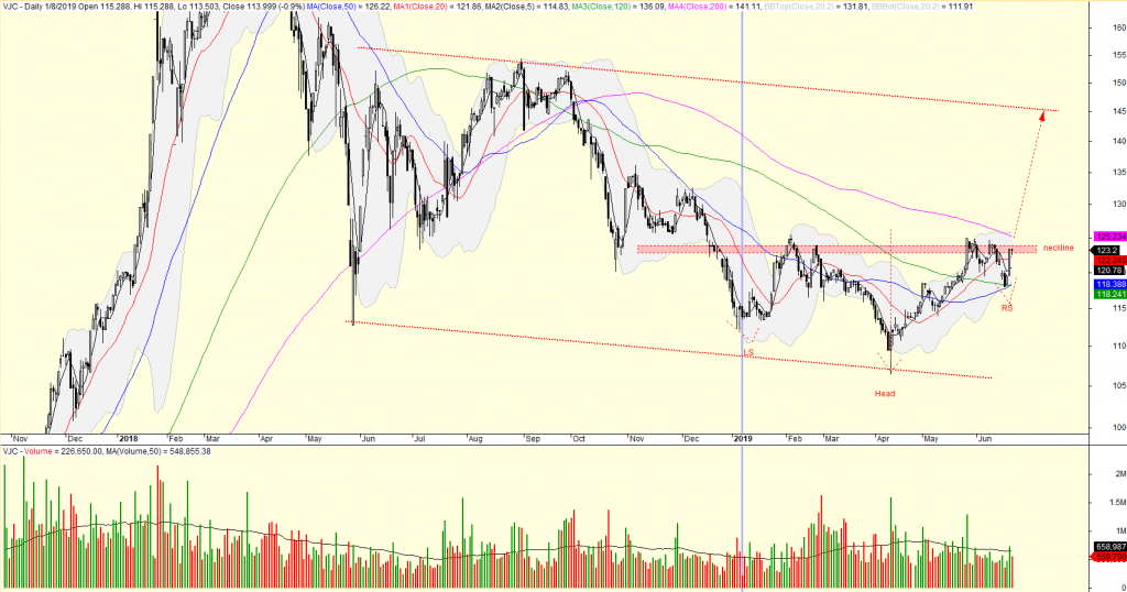 Giá cổ phiếu VJC đang đối ngưỡng với khang cự mạnh 125. Đó là sự hội tụ của đường MA200 ngày và neckline của mẫu hình vai-đầu-vai. Chỉ khi bứt phá qua ngưỡng này, khả năng VJC mới có thể tiệp cận vùng 140-145.