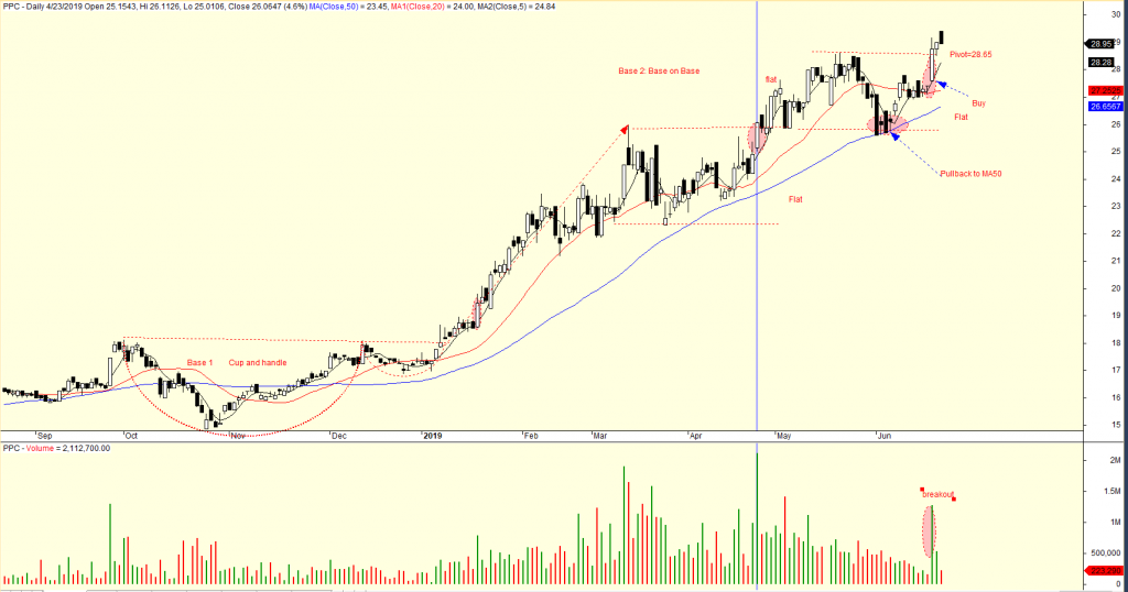 Trong đó, Nền Giá Phẳng Đầu tiên diễn ra trong 7 tuần, với độ sâu 13%, trong khi Nền Giá Phẳng thứ hai diễn ra trong 5 tuần với độ sâu 11%. Chú ý, đáy của nền giá phẳng thứ hai đã kiểm tra MA50 ngày với khối lượng thấp, sau đó bật tăng trở lại (Nơi trader nên giải ngân trước một phần ở đây). Điểm phá vỡ xuất hiện vào ngày 19/6/2019 khi MA5 ngày cắt lên MA20 ngày, và vượt lên trên điểm pivot (trader tiếp tục bổ sung thêm vị thế ở đây). Hiện tại PPC đang retest lại điểm pivot. Vì đây mới chỉ là nền giá thứ hai, tiềm năng tăng trưởng của PPC còn xa.