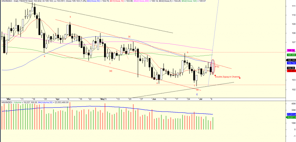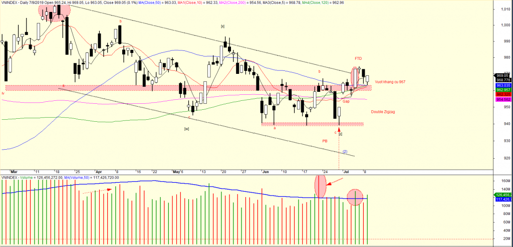 Đến ngày 9/7/2019, chỉ số HNX-Index xuất hiện NGày Bùng Nổ Theo Đà (FTD) ở Ngày 8. Đồng thời giá đóng cửa nẳm ở mức cao nhất và cao hơn MA50 ngày.