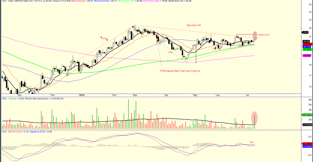 Các cổ phiếu BĐS KCN là điểm sáng tiếp theo. VGC chính là cổ phiếu có điểm mua trong phiên giao dịch ngày 9.7.2019. VGC có ngày phiên breakout vượt điêm pivot với khối lượng lớn. Mẫu hình ở đây là VCP của phù thủy Mark Minervini.