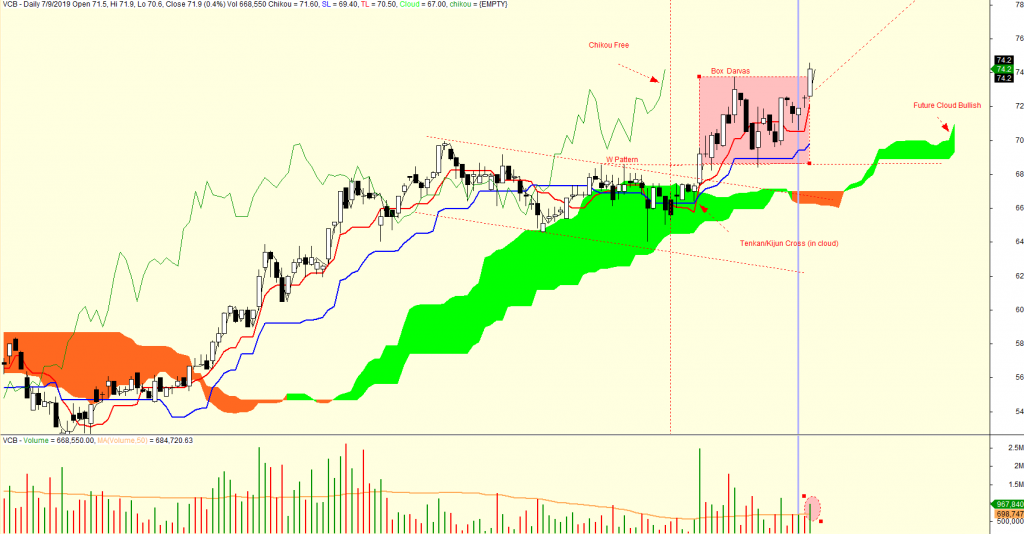 Đến phiên giao dịch ngày 11/7/2019, VCB đang tạo điểm breakout cho hộp Darvas nằm trên mẫu hình W/ . Chiếc hộp vuông của VCB hình thành trong 4 tuần với mức điều chỉnh chỉ 6%.