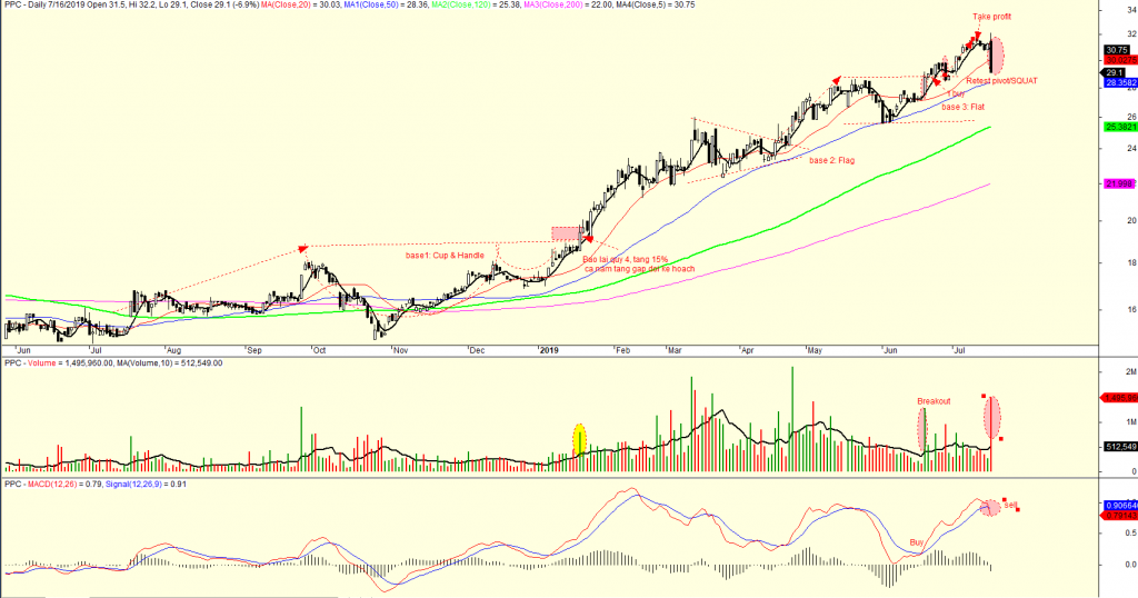 Các nền giá số 3, số 4 và số 5 là những nền giá vẫn có thể hoạt động nhưng rất dễ bị gãy và ẩn chứa nhiều rủi ro. Với kết quả kinh doanh tồi tệ ở quý 2, PPC đang có một ngày phân phối mạnh với giá cổ phiếu giảm sàn, volume lớn. Theo hướng dẫn của Mark Minervini tại chương 11 sách Tư Duy Nhà Vô ĐỊch Đầu Tư CHứng Khoán, đây là dấu hiệu chốt lãi rất rõ ràng.
