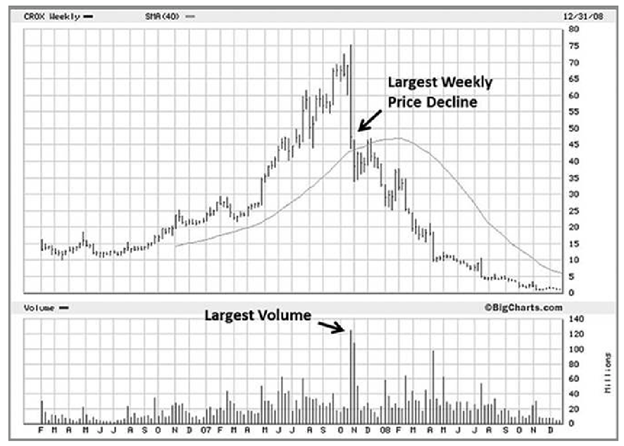 Hình 5-4 Cổ phiếu Crocs (mã CROX) năm 2008. Vào ngày 1 tháng 11 năm 2007, Crocs công bố lợi nhuận tăng 144%. Tuy nhiên, giá cổ phiếu bất ngờ giảm 36% vào ngày hôm đó với khối lượng cao nhất kể từ khi IPO. Cổ phiếu này cũng đã kết thúc tuần với mức giảm mạnh nhất (tính theo tuần) với khối lượng lớn nhất.