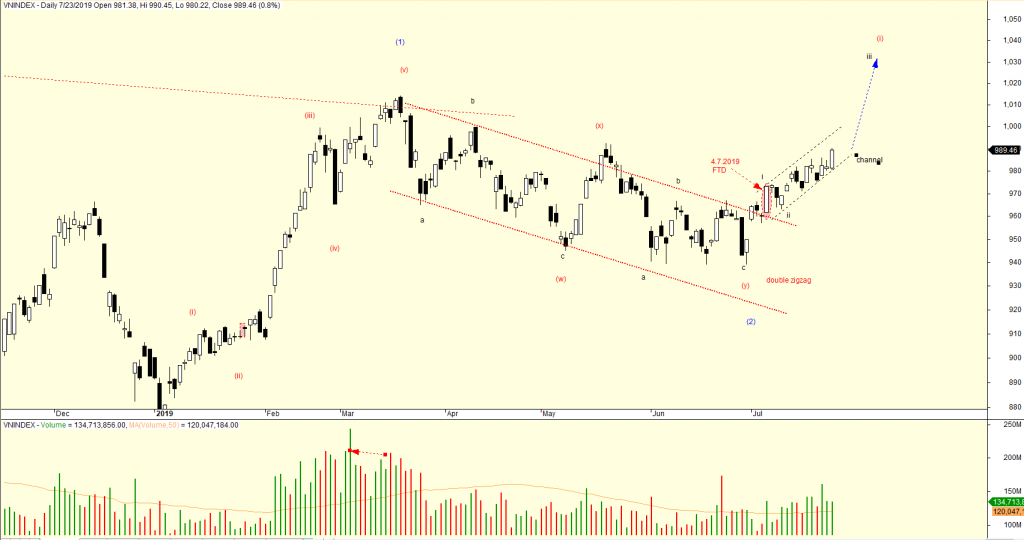 Trên đồ thị sóng Elliott của VN-Index, một kênh giá nhỏ đang hình thành. Nếu kịch bản đêm sóng của chúng ta là hợp lý, VN-Index nên tiếp tục tăng tốc và bứt phá lên trên kênh giá.