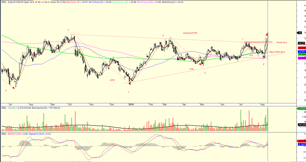 REE có mẫu hình VCP của phù thủy Mark Minervini hoặc mẫu hình “Cá Sấu Săn Mồi”, Điểm pivot là 34.5. Phiện hôm nay, tôi kịp bổ sung vị thế sau khi mua theo Dellphic Buy. REE hôm nay có phiên Breakout với khối lượng lớn.