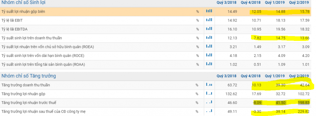 Hãy xem PVI có code 33 như thế nào? Lợi nhuận gộp biên tăng dần qua 3 quý gần đây từ 12.05% lên 15.8%. Tăng trưởng doanh số tăng từ 10% lên 43% và tăng trưởng lợi nhuận từ -3.3% lên 229%