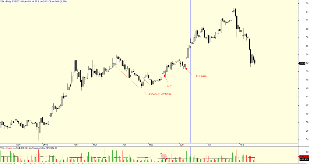 Cứ thế, tôi chỉ làm đơn giản công việc của trẻ cấp 2, tìm bất cứ điểm nào có kênh giá song song. Cùng thời điểm giữa tháng 6, tôi mua VEA và sau đó tiếp tục bổ sung vị thế mua vào tháng 7. Gần như các tín hiệu mua của VEA và VCB rất sát nhau. Bạn thấy đó, chỉ cần phát hiện kênh giá và tìm cơ hội mua. Thực ra trong hình của VEA, mọi thứ có biến hóa hơn một chút, tôi không mua tại điểm breakout kênh giá như VCB mà chờ điểm mua khác. Đây là một cách giao dịch “bí mật” khi sử dụng kênh giá song song.