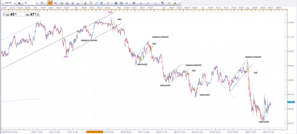 Không chỉ cổ phiếu, tôi giao dịch theo cách tương tự cho cả forex và hàng hóa. Sau đây là cặp USD/JPY trong suốt thời gian từ tháng 3 đến nay. Gần như tôi chỉ trading theo một chiến lược duy nhất “Sóng Zigzag trong kênh giá” và kết quả cực kỳ ấn tượng.