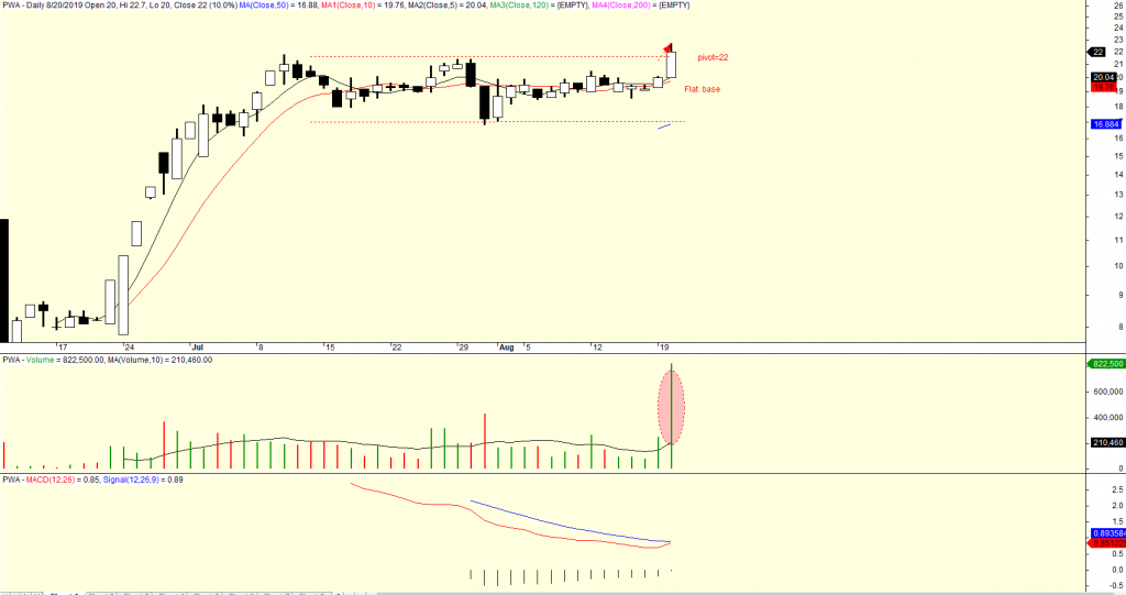 PWA tăng 174% kể từ khi niêm yết sau đó tích lũy bằng nền giá phẳng (flat base) trong gần 6 tuần. Độ sâu nền giá là 20%. Điểm pivot là 22. Phiên ngày 20/8/2019, PWA có điểm phá vỡ với khối lượng tăng đột biến.