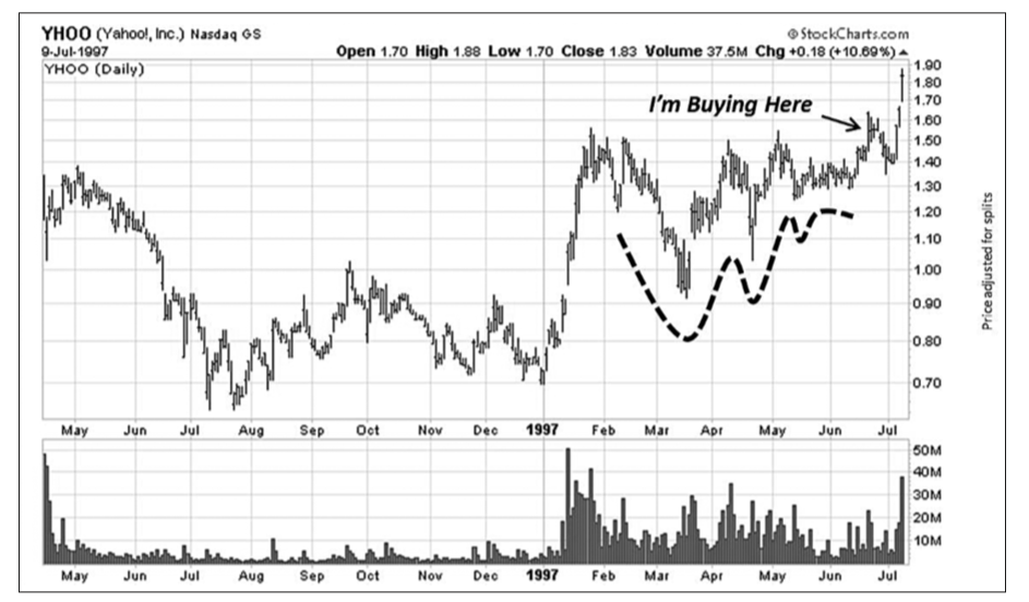 Vào năm 1997, tôi không có nhiều cổ phiếu để chú ý, vì thế tôi chỉ mua Yahoo! Tuy nhiên, sau khi cổ phiếu này tăng gấp 10 lần vào năm 1999, thanh khoản lại không đủ để tôi thoát hàng. Bất ngờ, mọi người đều biết đến Yahoo!, American Online, Qualcomm, Nokia, Oracle và một vài cái tên khác mà cách đây 1 hoặc 2 năm, mọi người sẽ bỏ ngoài tai khi nghe đến. Tại thời điểm đó, không ai muốn nghe về chúng vì đó là những cái tên xa lạ và mức giá có vẻ khá đắt đỏ. Các cổ phiếu này bắt đầu nổi lên khi thị trường chung trải qua đợt sụt giảm thị trường con gấu và các nhà đầu tư toàn cầu chỉ chú ý đến cuộc khủng hoảng Đông Á. Vào tháng 7 năm 1997, tôi mua Yahoo! khi cổ phiếu này xuất hiện điểm phá vỡ từ nền giá đầu tiên và giá tăng vọt 7,800% trong 29 tháng. Yahoo! trở thành cổ phiếu dẫn dắt thị trường trong ngành tương đối mới được gọi là cung cấp Internet.
