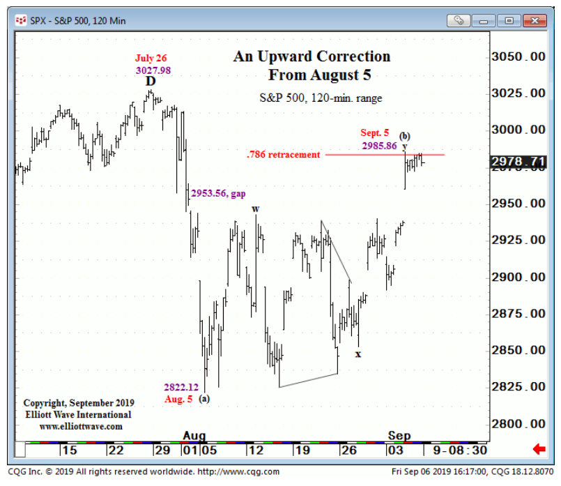 Trên đồ thị 120 phút, SP500 đã hoàn tất sóng (b) với dạng double Zigzag w-x-y. Sóng (c) sắp tới sẽ đẩy SP500 giảm trở lại. Mức đỉnh 2985.86 chính là Fibonacci 78.6% của sóng (a).