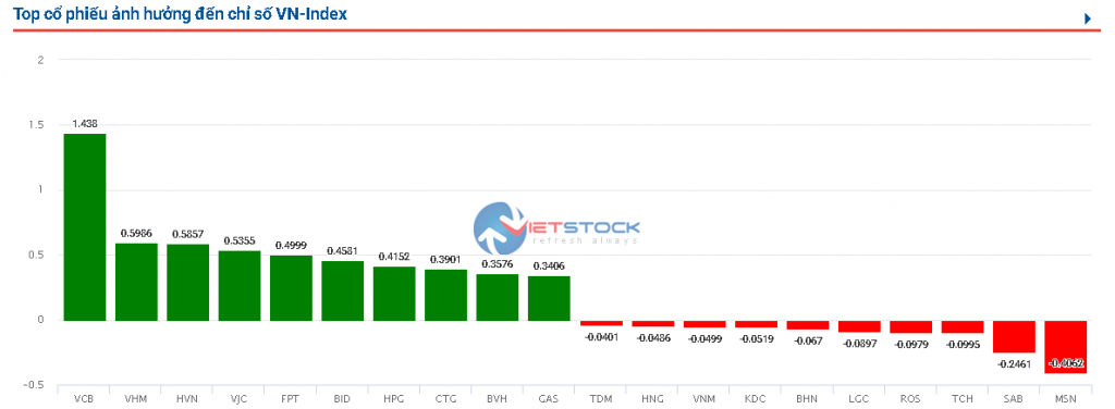 Sự khởi sắc của một số mã cổ phiếu vốn hóa lớn như VCB, FPT, BID, VHM…cùng với đà phục hồi của Họ Viettel, BĐS KCN giúp thị trường tăng điểm. Theo đó chỉ số VN-Index tăng 0.7% và đóng cửa ở mức 976.07 điểm. Thanh khoản tăng cao hơn phiên hôm trước. Đây là dấu hiệu tích cực. Đà phục hồi của TTCK Việt Nam được ảnh hưởng bởi toàn bộ TTCK Châu Á sau khi TTCK Mỹ tăng điểm mạnh vào ngày thứ 4.