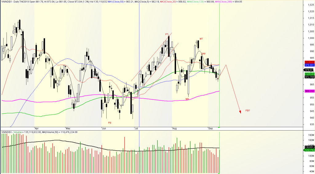 Tuy nhiên, chỉ số VN-Index vẫn chưa giành lại được mức hỗ trợ quan trọng từ MA50 ngày tại 978.01 điểm. Do đó, tôi vẫn duy trì quan điểm tiêu cực cho xu hướng của VN-Index. MA20 ngày nằm ngay sát MA50 ngày. Vẫn chưa có ngày bùng nổ theo đà để kích hoạt xu hướng tăng. Chúng tôi sẽ quay trở lại kịch bản tăng giá nếu như chỉ số VN-Index có phiên bùng nổ theo đà đưa giá nằm trên các đường MA20 và MA50 ngày.
