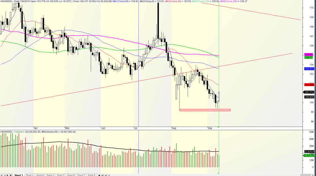 Sự phục hồi của VN-Index hiện nay đang được đánh dấu là đợt nỗ lực hồi phục (rally attempt). Chỉ số HNX-Index đang test lại đáy của cây Pin Bar và là ngày 2 của đợt Nỗ Lực Hồi Phục.