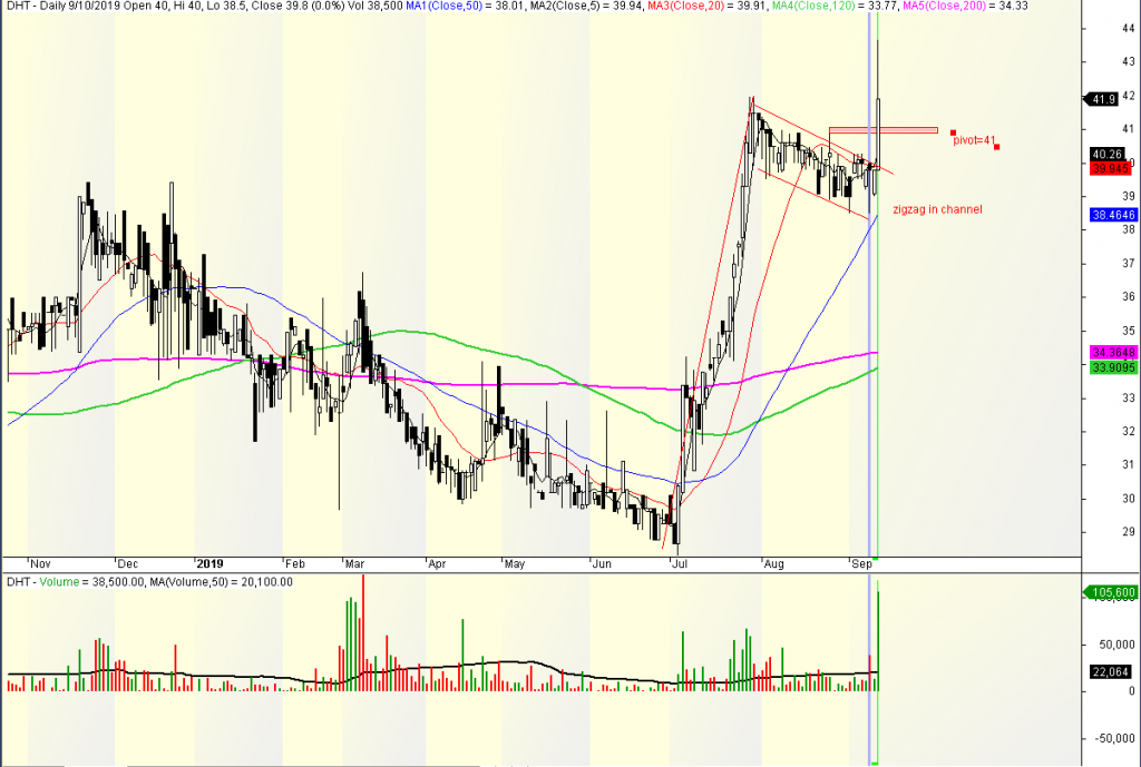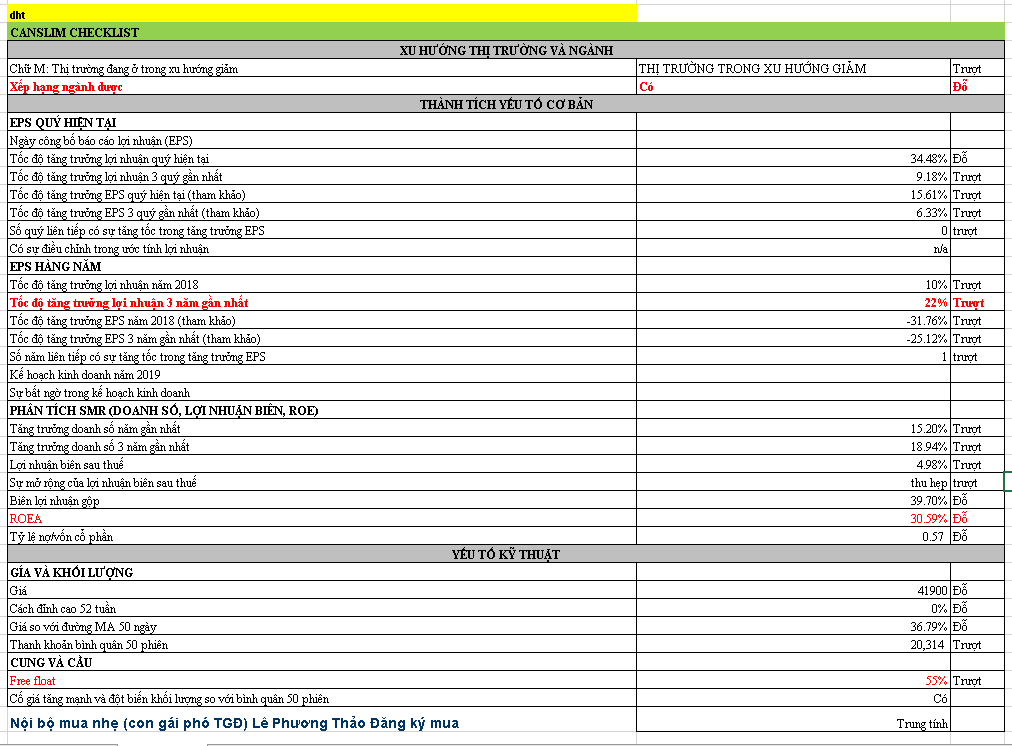 Lưu ý DHT không tham gia vào danh sách đỉnh 52 tuần vì không đáp ứng yêu cầu thanh khoản của chúng tôi. Bảng CANSLIM Checklist cho thấy DHT có tăng trưởng lợi nhuận quý hiện tại gần 35%, tăng trưởng lợi nhuận 3 năm tuy trượt nhưng gần đạt chỉ tiêu (22%), tuy nhiên nếu mở rộng ra 4 năm lại đỗ (28%); ROE cao 31% và lợi nhuận biên tuy thu hẹp ở quý hiện tại nhưng quý 4.2018 và quý 1.2019 lại mở rộng. Không có giao dịch đáng chú ý của cổ đông lớn. Tỷ lệ nợ thấp.