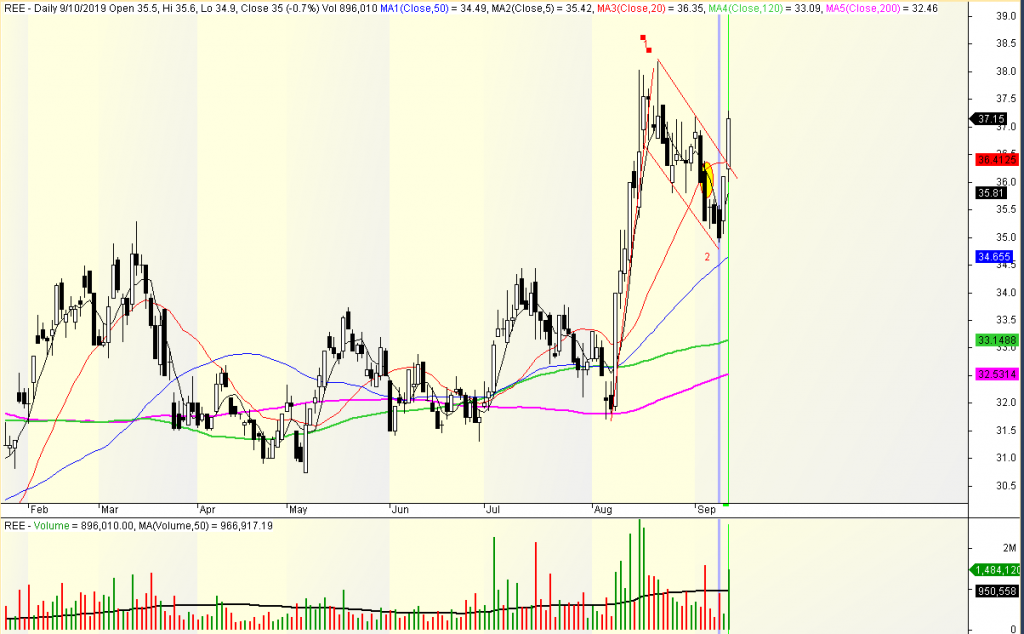 Cũng với mẫu hình trên (zigzag trong kênh giá), REE đang quay trở lại xu hướng tăng.