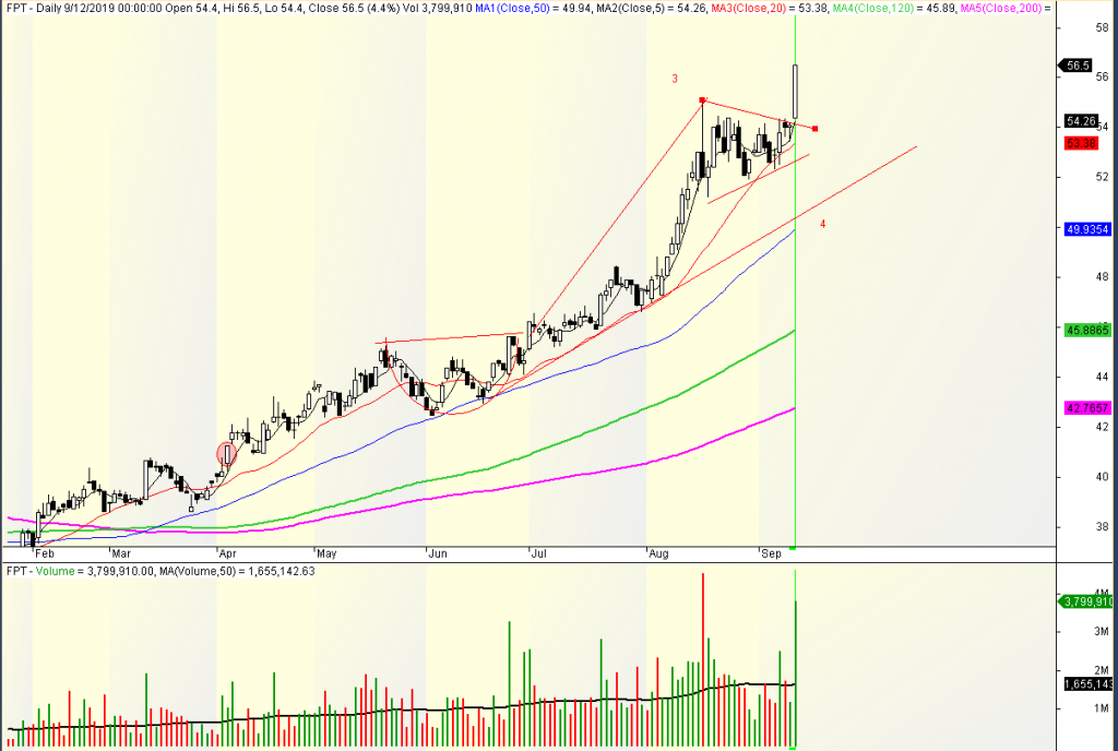FPT thay vì thiết lập nền giá phẳng lại thiết lập một tam giác nhỏ (triangle). Phiên hôm nay chứng kiến điểm breakout của FPT.