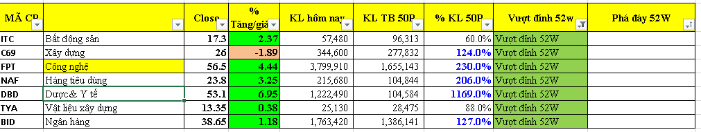 Có 7 cổ phiếu vượt đỉnh 52 tuần trong ngày hôm nay trong khi danh sách cổ phiếu phá đáy 52 tuần vẫn duy trì ở mức 15 cổ phiếu. Số lượng Leader vẫn đang giảm. FPT và ITC là hai cái tên mới trong danh sách vượt đỉnh 52 tuần.
