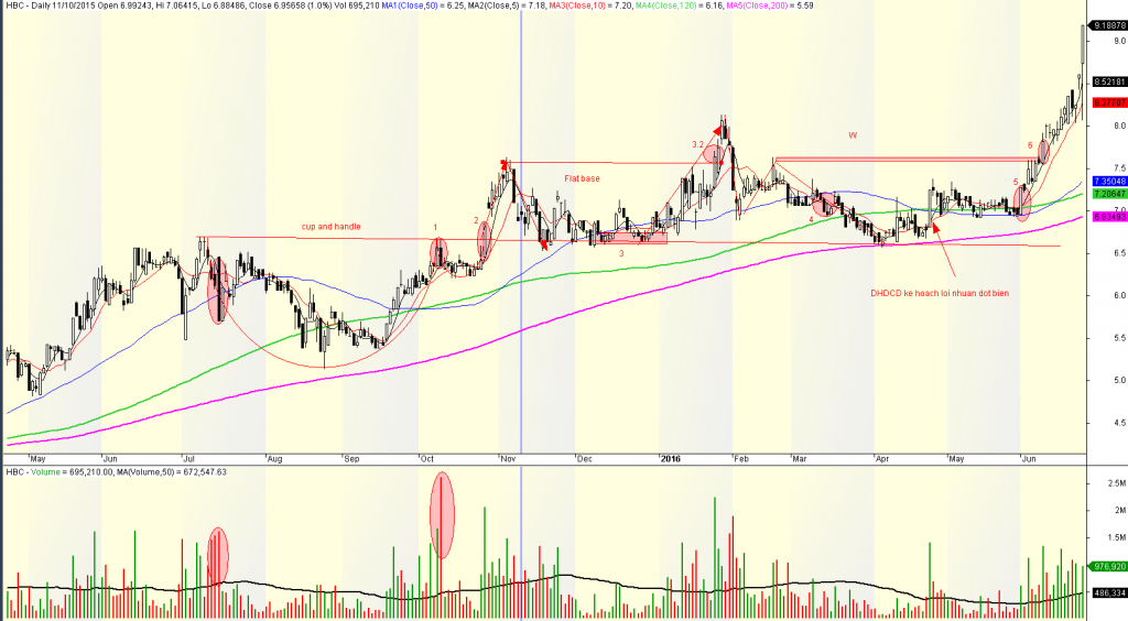 Trường hợp của HBC không hoàn toàn là một điểm breakout giả tại điểm số 2 nhưng đó là một điểm breakout yếu vì mẫu hình chiếc cốc-tay cầm không hoàn hảo. Bên cạnh đó là sự điều chỉnh mạnh của thị trường chung vào tháng 11/2015 khiến cổ phiếu này phải kéo về MA50 ngày.