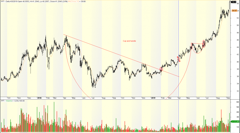 Ngày 25/6/2019, chúng tôi kêu gọi mua FPT khi cổ phiếu có điểm breakout mô hình chiếc cốc-tay cầm
