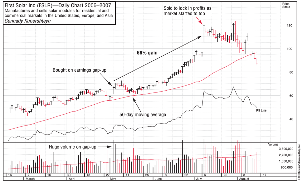 Hãy cùng nhìn lại một số giao dịch chiến thắng của Gennady để học hỏi kinh nghiệm. First Solar mua khi có khoảng trống tăng giá với khối lượng lớn khi công ty này công bố lợi nhuận lớn.